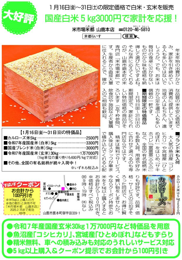 さて、お米マイスターの資格を持つ、「米市場米都(こめっと) 山鹿本店」が1月下旬の大特価セールを開催いたします✡・*.